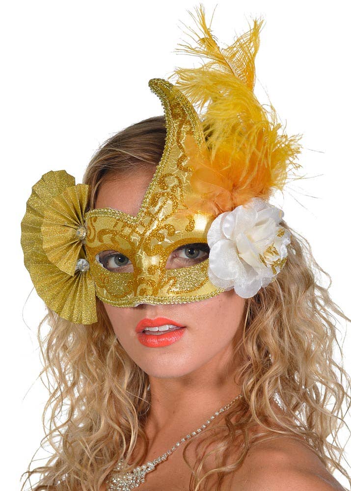 - The left side of the mask is decorated with a yellow feather and cream coloured rose with gold glitter edging.
