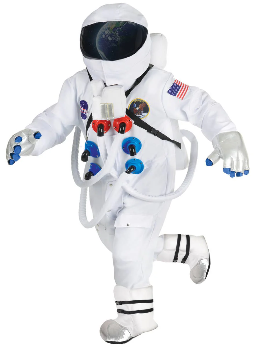 - Costume is complete with a full head white plastic astronaut helmet with a semi transparent black visor that lifts up at the front.